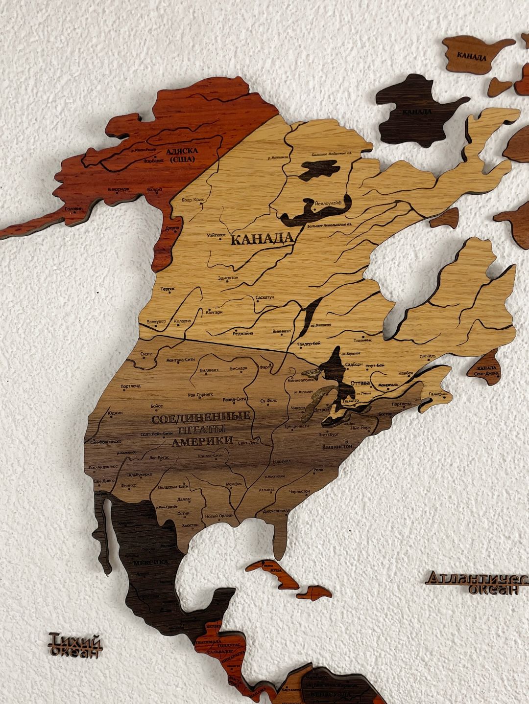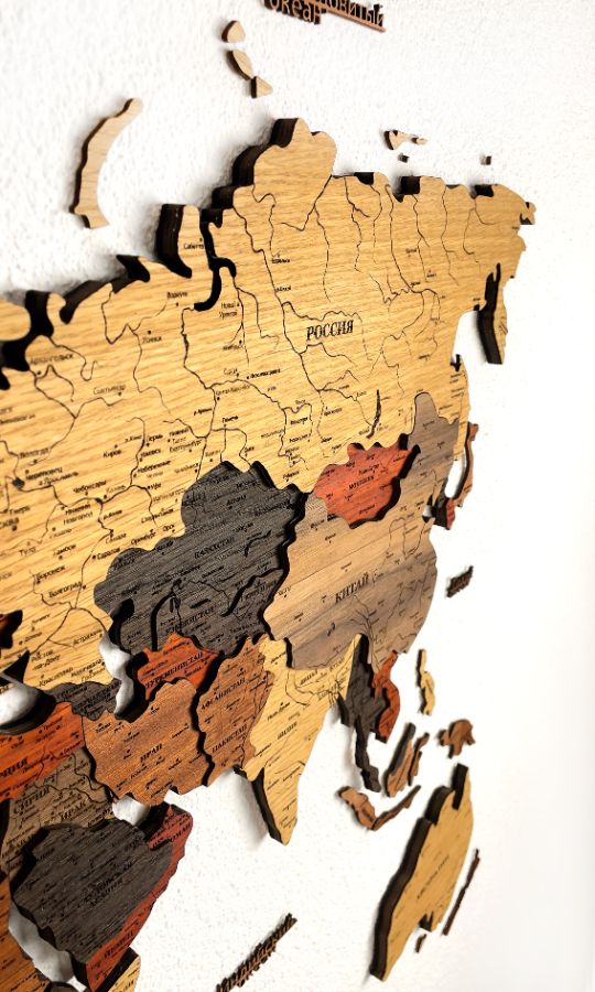 Каждый элемент деревянной карты мира имеет четкую гравировку стран, столиц, крупных городов, рек и озер.